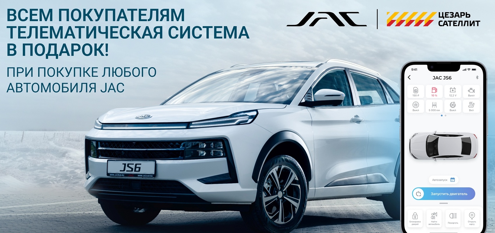 С 01 ноября 2024 года JAC совместно с Цезарь Сателлит подготовили специальную акцию для всех новых владельцев JAC – предустановленная современная телематическая система JAC ONLINE в подарок*.